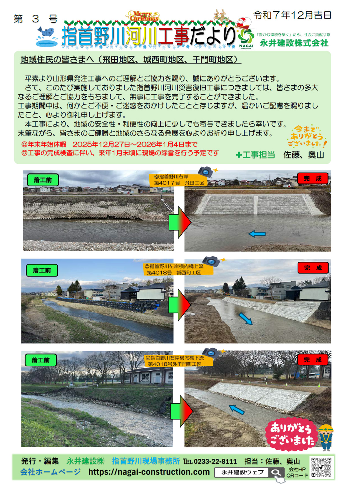 今年の春から工事が進められてきた『指首野川河川災害復旧工事』が完成しました。 各地区の皆様には、温かいご配慮を賜りましたこと、心より御礼申し上げます。 工務部:佐藤大・奥山洸